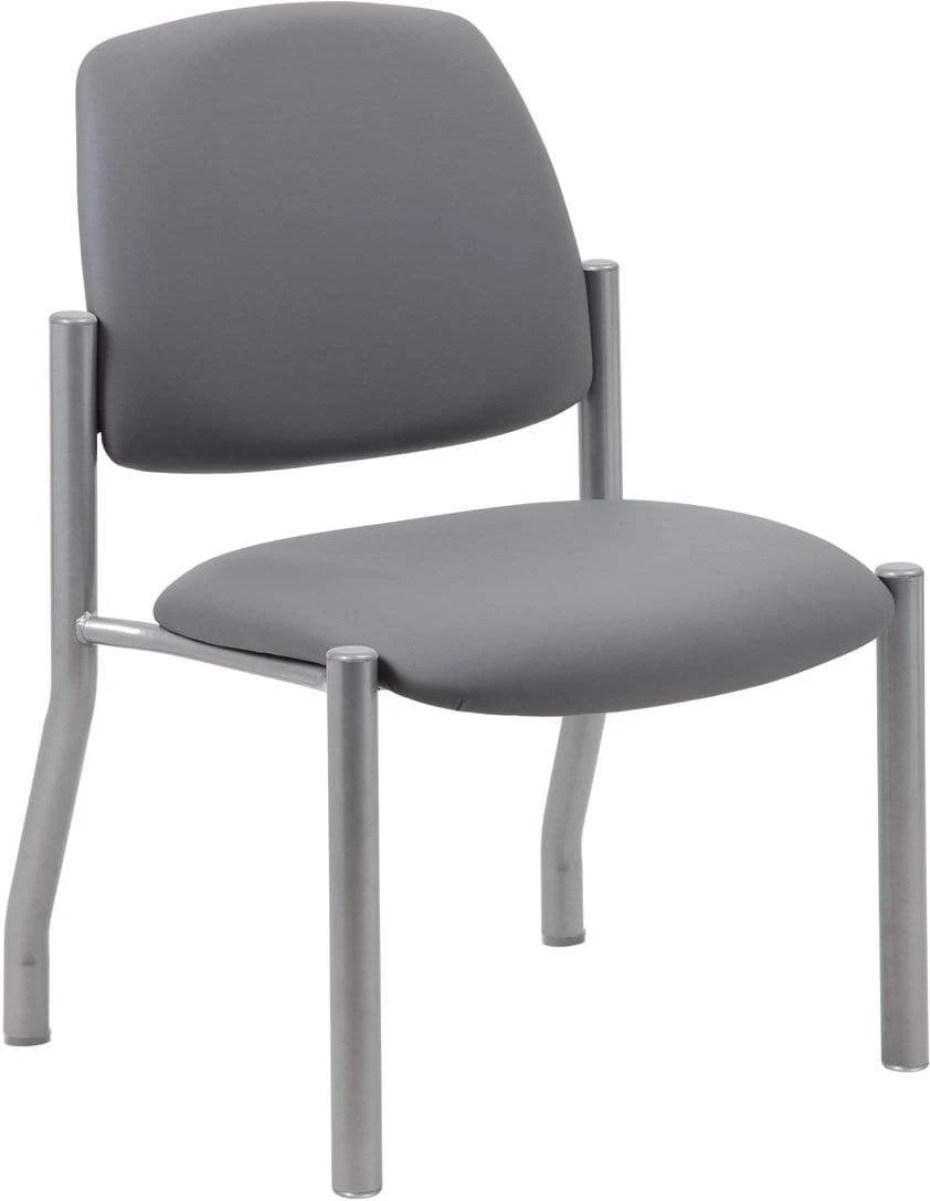 This heavy duty and comfortable mid back guest chair is perfect for anyone seeking additional seating in any room or office. The guest chair is designed with a strong and easy to clean grey antimicrobial vinyl material that lends a professional appearance along with a sturdy four leg tubular silver steel base that offers coziness and strength. The chair stands at a fixed height with an streamlined armless design and boast a weight capacity of 300 lbs.