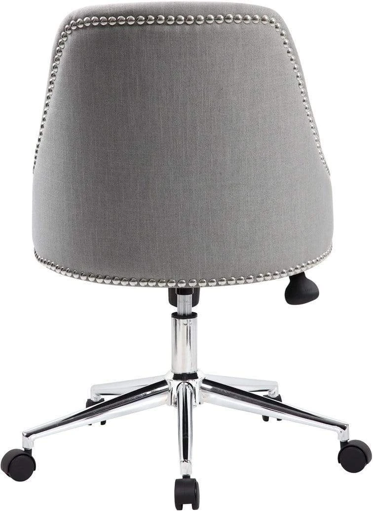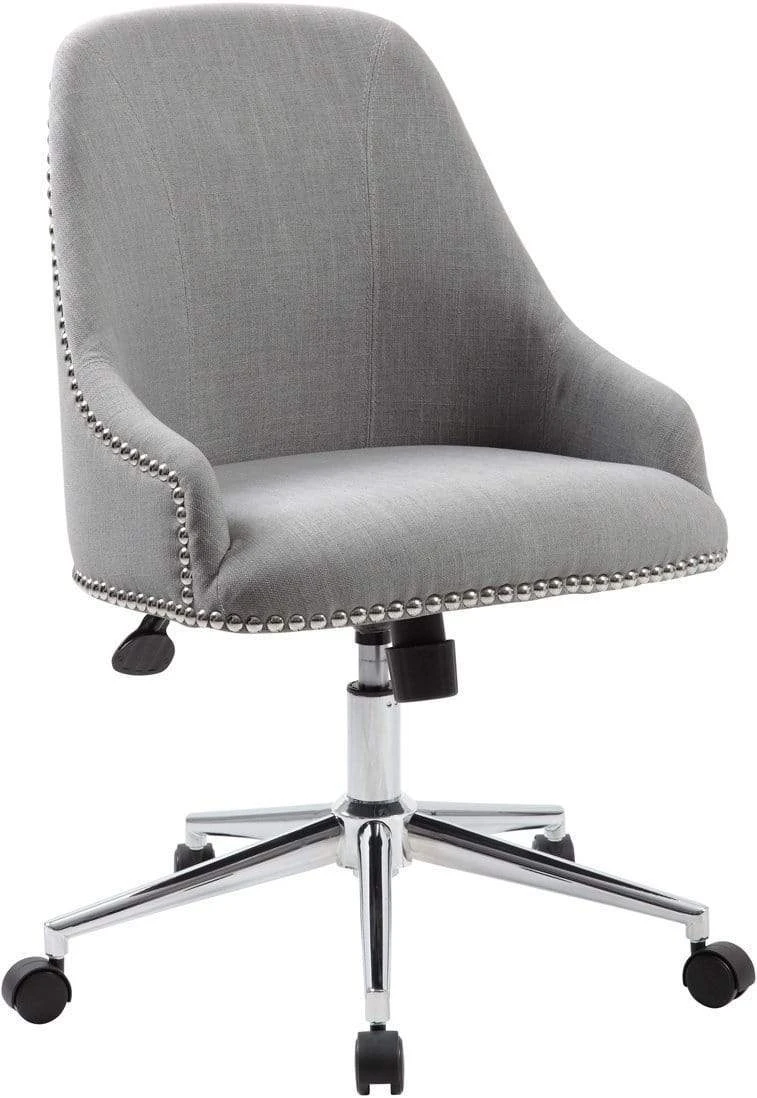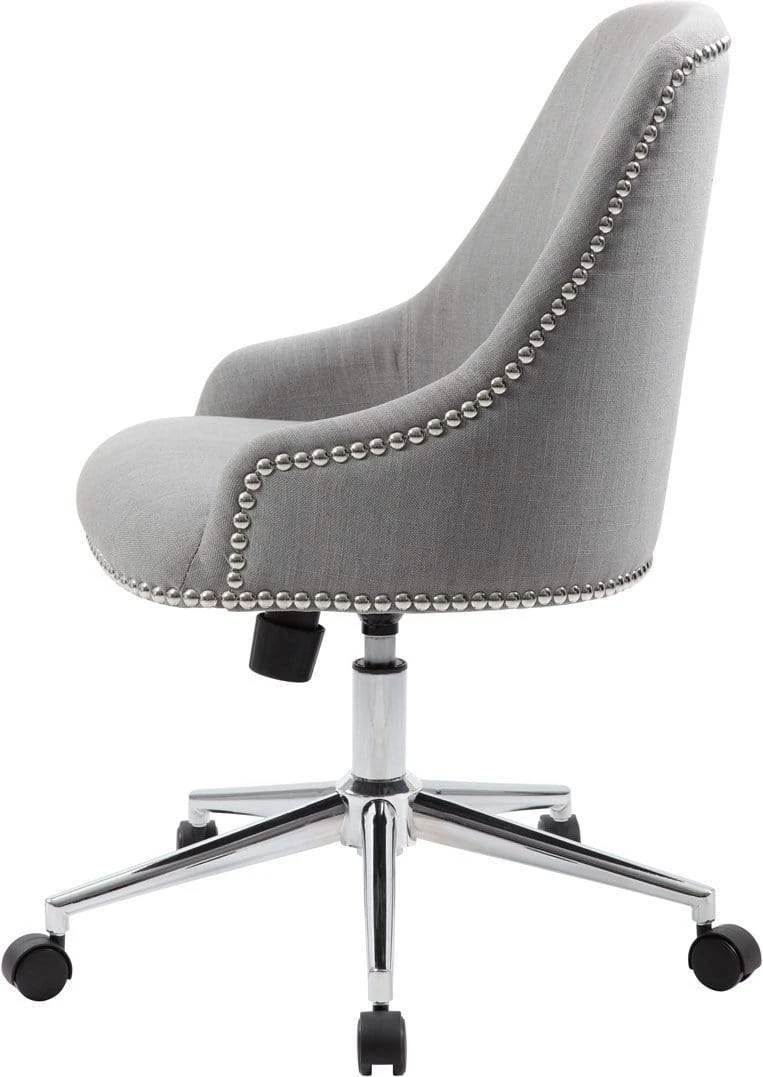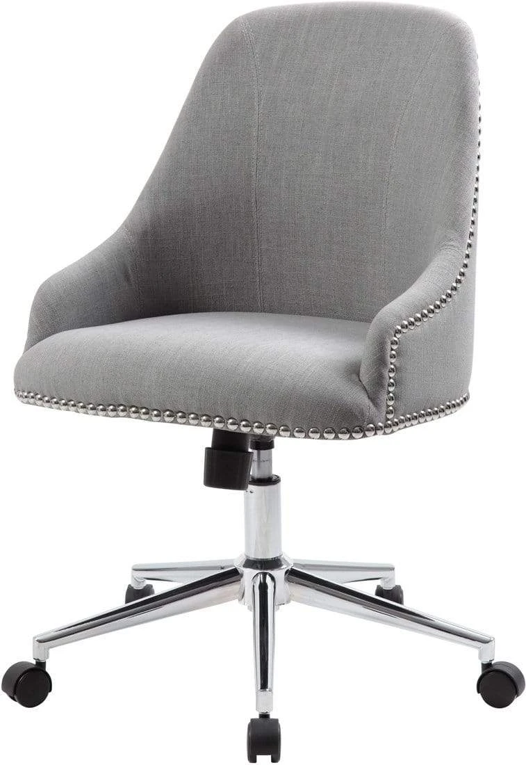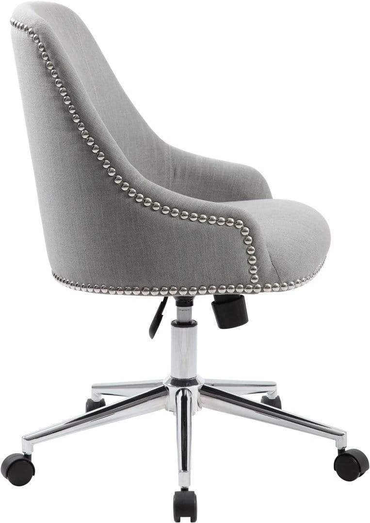 The Carnegie desk chair in grey is made from quality linen and features a gorgeous design utilizing nail head trim. It boasts a strong, sturdy high crown chair base in chrome with 2 inch nylon dual wheel casters for a smooth roll and the chair has a weight limit of 275 lbs. The chair features a spring tilt mechanism that changes the angle of the entire seat relative to the floor and allows one to transfer some of the upper body weight to the backrest of the chair. In addition to the spring tilt the chair has tilt tension, a pneumatic gas lift for easy height adjustments and an upright lock.