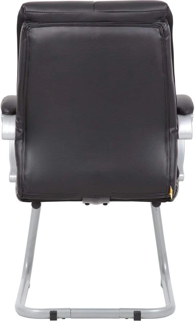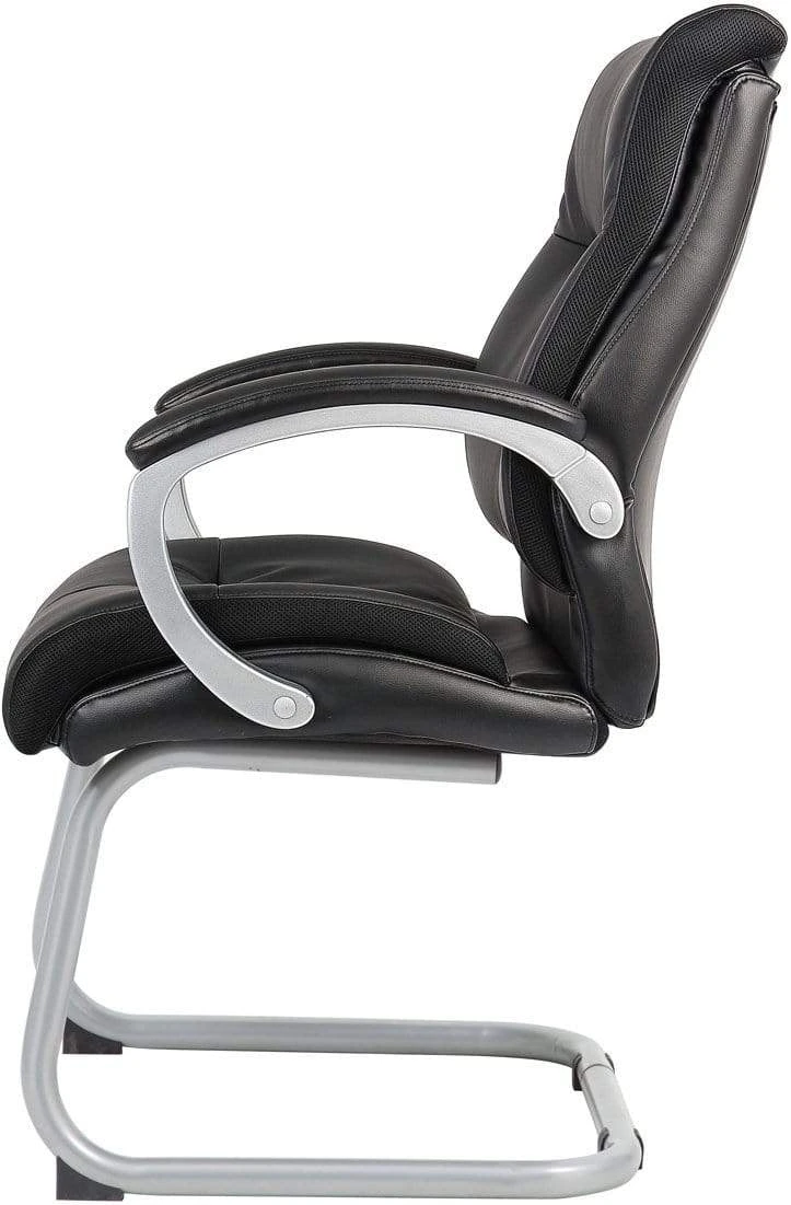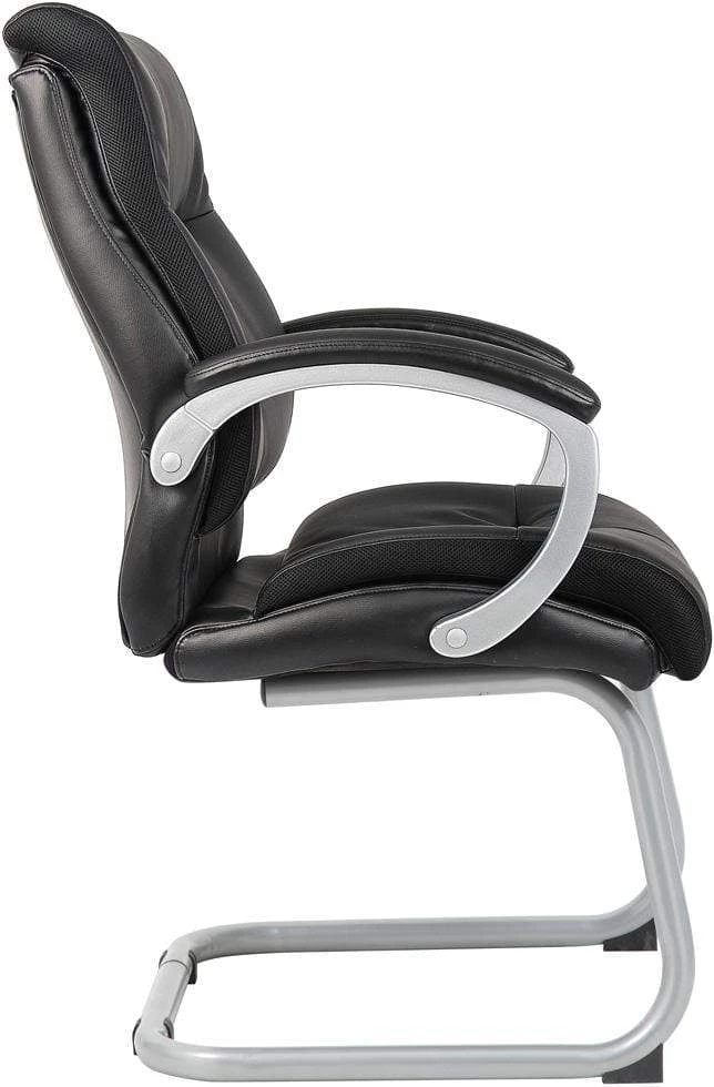 This double plush guest chair makes a great addition to any office, conference room, or sitting area. It is elegantly upholstered in black LeatherPlus, a delightful combination of leather and polyurethane that provides extra softness and durability. The seat and back cushions are accented with ventilated mesh panels that circulate the air. Additional features include silver arms, a cantilever base, and an ergonomic seat with reinforced lumbar support. It pairs perfectly with our double plus executive series chairs (B8771 and B8776).