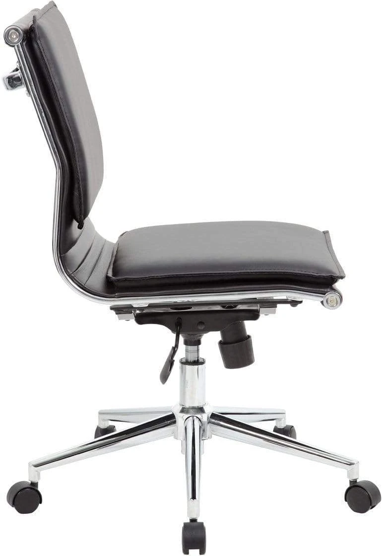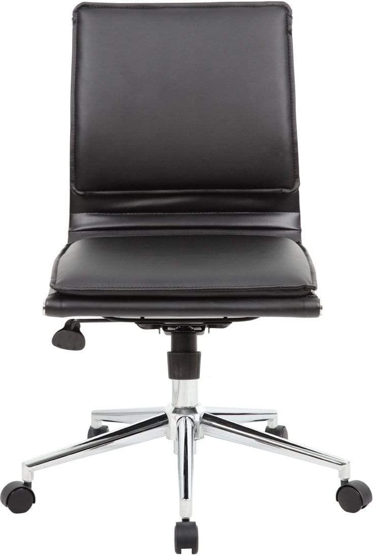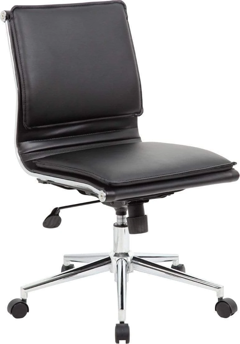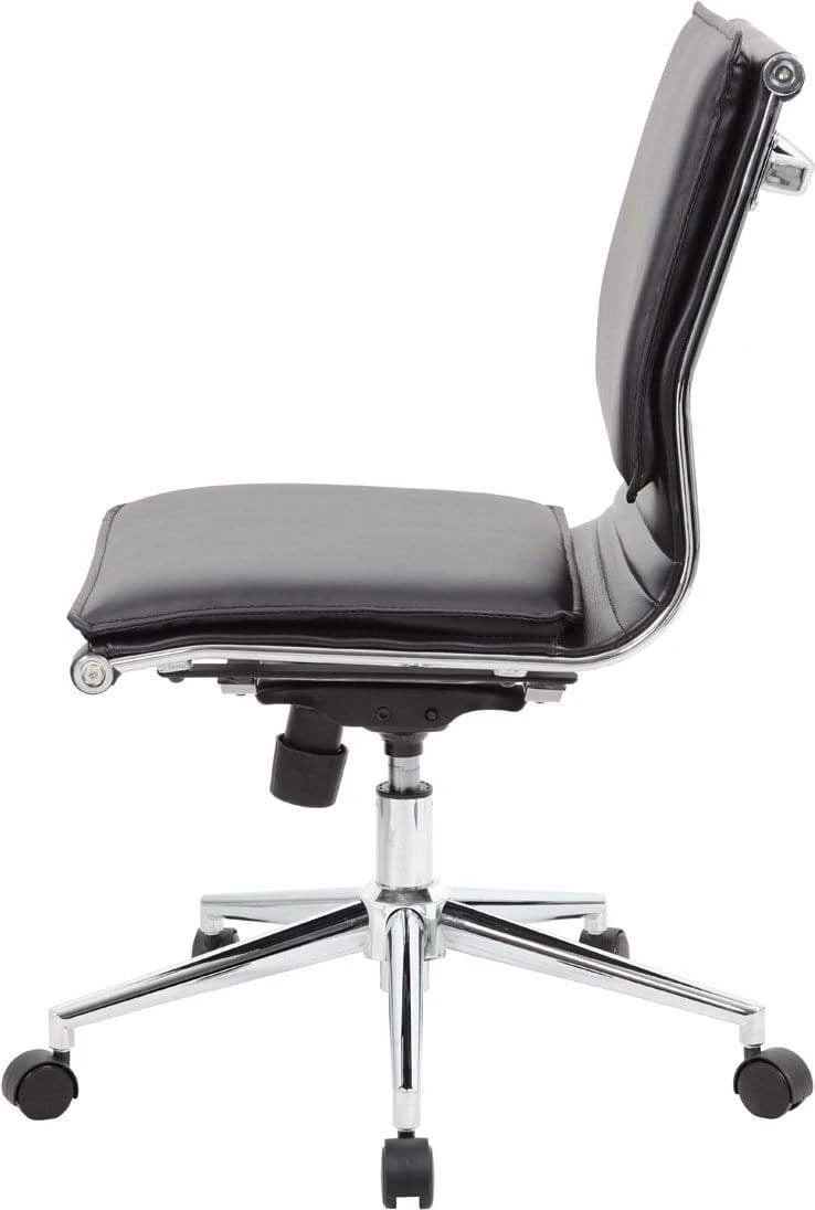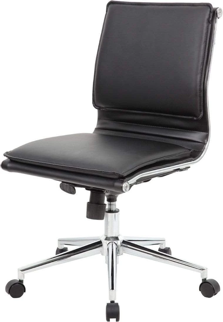 This Black Armless Task Chair is upholstered in Black LeatherPlus (leather and polyurethane), providing added softness and durability. It has an upright locking position feature, providing comfortable back support. The pneumatic adjustable gas lift allows for easy seat height adjustment, to help you find the personalized sitting style that suits you and your work environment. The adjustable tilt tension control allows you to customize the optimal angle at which you sit. The chair sits on a large 27ā high crown chrome base that provides enhanced stability. The hooded double wheel casters make it easy to move and shift directions.