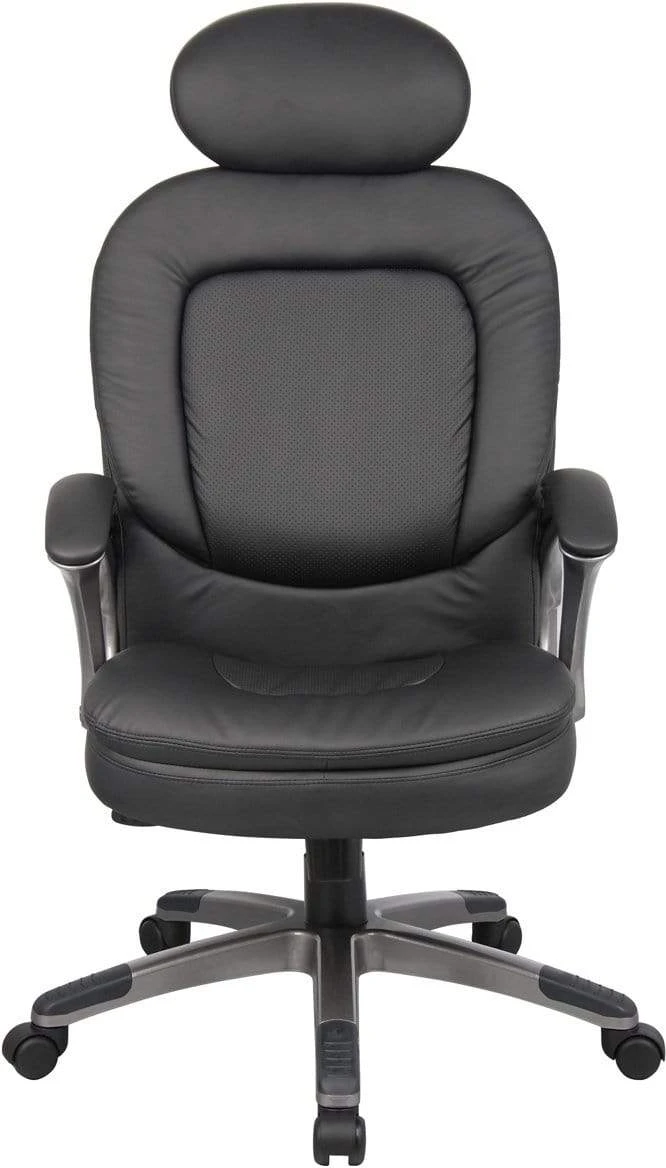Our high back executive chair features a patented perforated pillow top design and is beautifully upholstered with impeccably soft, durable Caressoft upholstery. Additional features include a tasteful pewter finish, padded armrests, and comfortable cushions. Structurally, the chair has an upright locking position, pneumatic gas lift seat height adjustment, and adjustable tilt tension control. Of course, all of this is supported by a sturdy 27” nylon base that is propped up by five hooded double wheel casters.