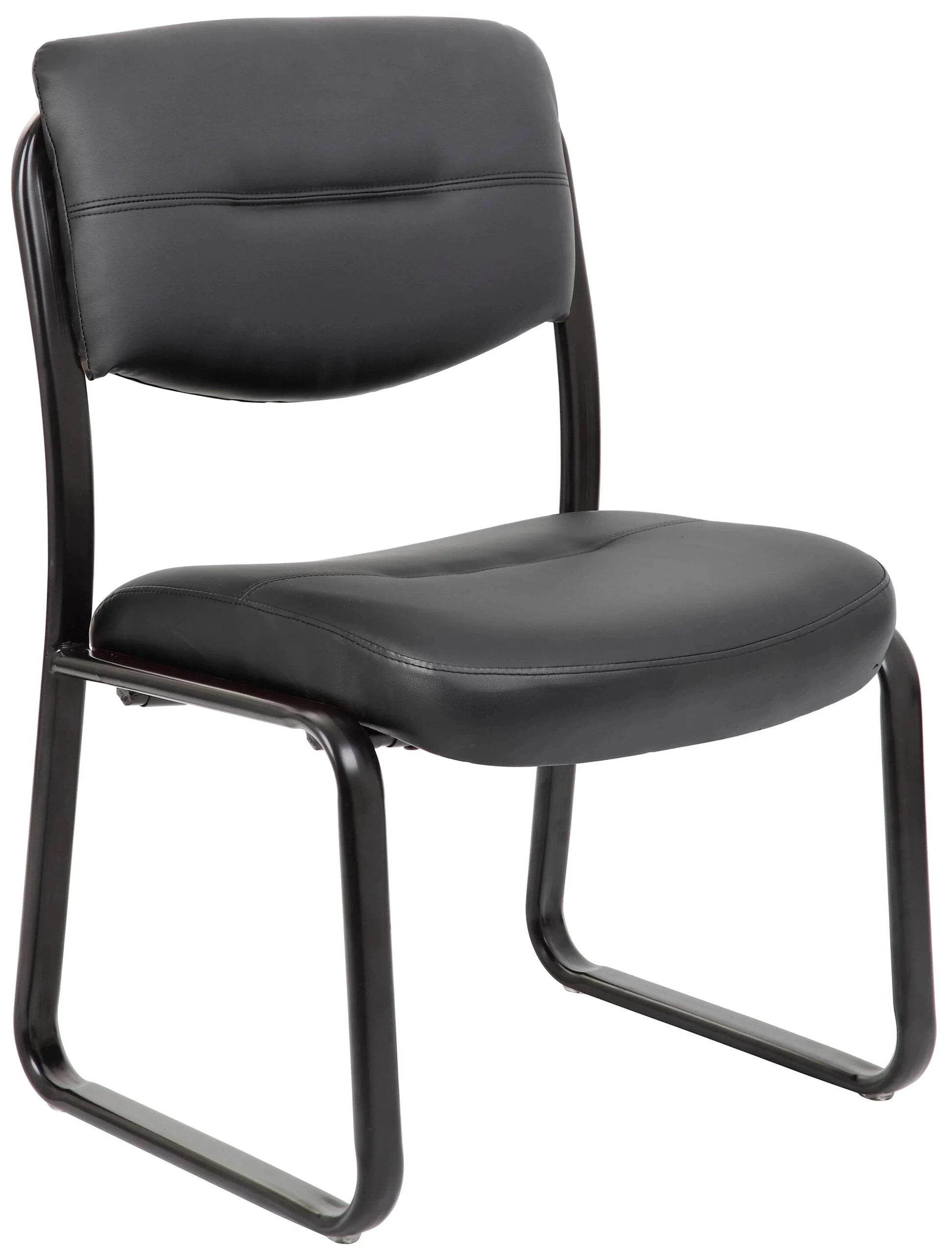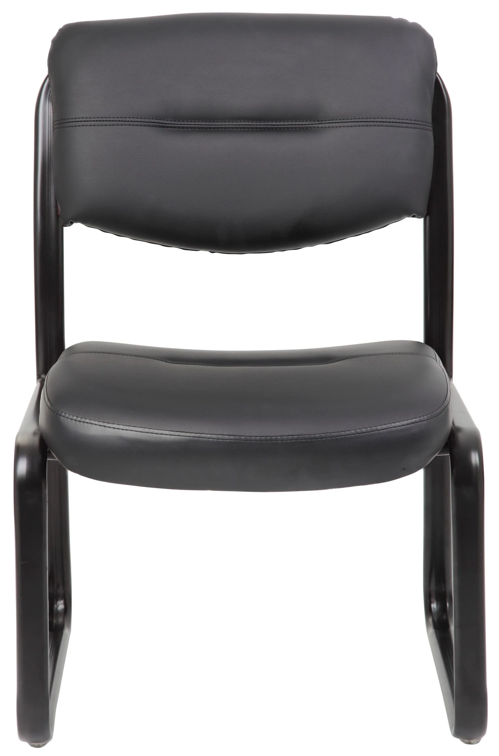 This office side chair from Boss Office Products features thick, foam-filled, and contoured cushions upholstered in black Leatherplus™. Leatherplus™ is leather that is polyurethane infused for added softness and commercial-grade durability. Other features include a polished tubular steel frame coated with a scratch-resistant finish, built-in lumbar support, and a sled base for easier mobility over carpet. This office side chair meets or exceeds ANSI/BIFMA standards.