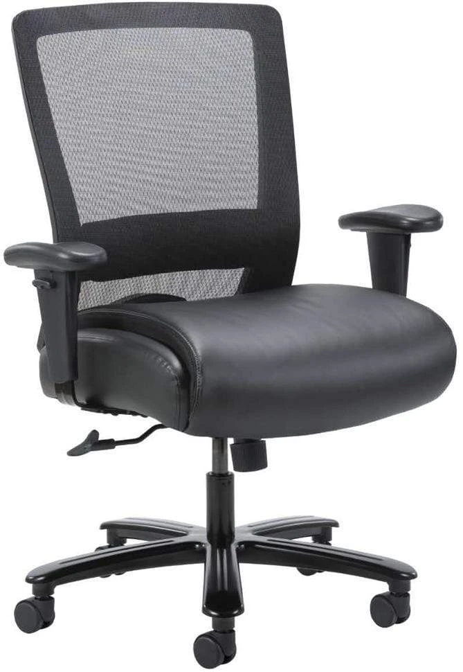Our heavy duty mesh chair makes the perfect companion to any office, board room, or study. Its 400-pound weight capacity ensures a comfortable sitting experience with a broad range of body types. Its seat is elegantly upholstered in black LeatherPlus and features soft pillow top cushions for added comfort. The mesh back allows the cushion to breathe with no moisture build-up. It has height-adjustable arms. The chair features pneumatic gas lift seat height adjustment, a heavy-duty spring tilt mechanism, and tilt tension control. All of this sits atop a large 29” steel base with five large, heavy-duty casters.