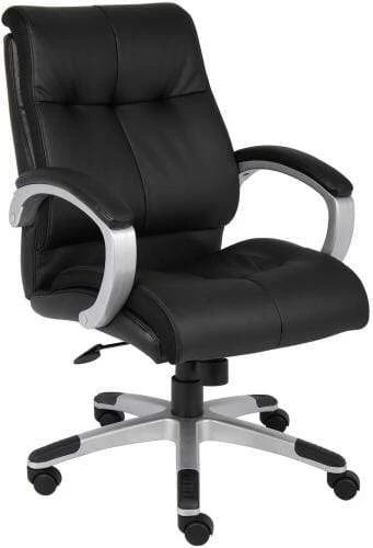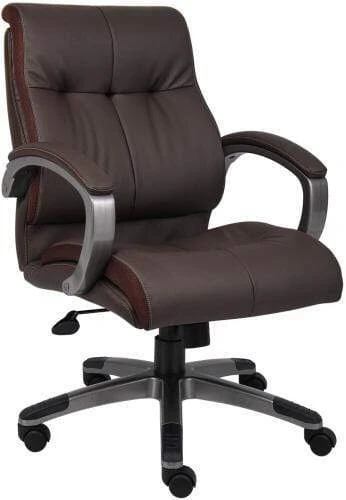 This mid back office chair from Boss Office Products is available in your choice of brown or black LeatherPlus upholstery. LeatherPlus is a urethane infused leather that is soft to the touch yet extremely durable. Other features of this mid back office chair include thick, double padded seat and backrest cushions, ventilated mesh side panels on both the seat and backrest, built in lumbar support, pneumatic seat height adjustment, 360 degree swivel, tilt with adjustable tilt tension, upright tilt lock, leather padded loop arms, pewter or silver frame accents and a heavy duty five star base with dual wheel carpet casters. This chair meets or exceeds ANSI/BIFMA standards.