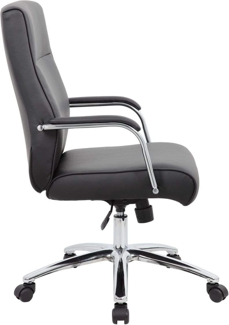 The Modern Executive Conference Chair in black is a fine looking chair made with high quality CaressoftPlus vinyl. CaressoftPlus is a trademarked, ultra-soft, breathable upholstery that looks & feels like leather, but more durable & easy to clean. The chair also features a spring tilt mechanism that allows one to change the angle of the entire seat relative to the floor and allows one to transfer some of the upper body weight to the backrest of the chair. In addition to this the chair also boasts a sturdy 27 inch chrome base with 2 inch nylon dual wheel casters and a 275 lbs. weight capacity.