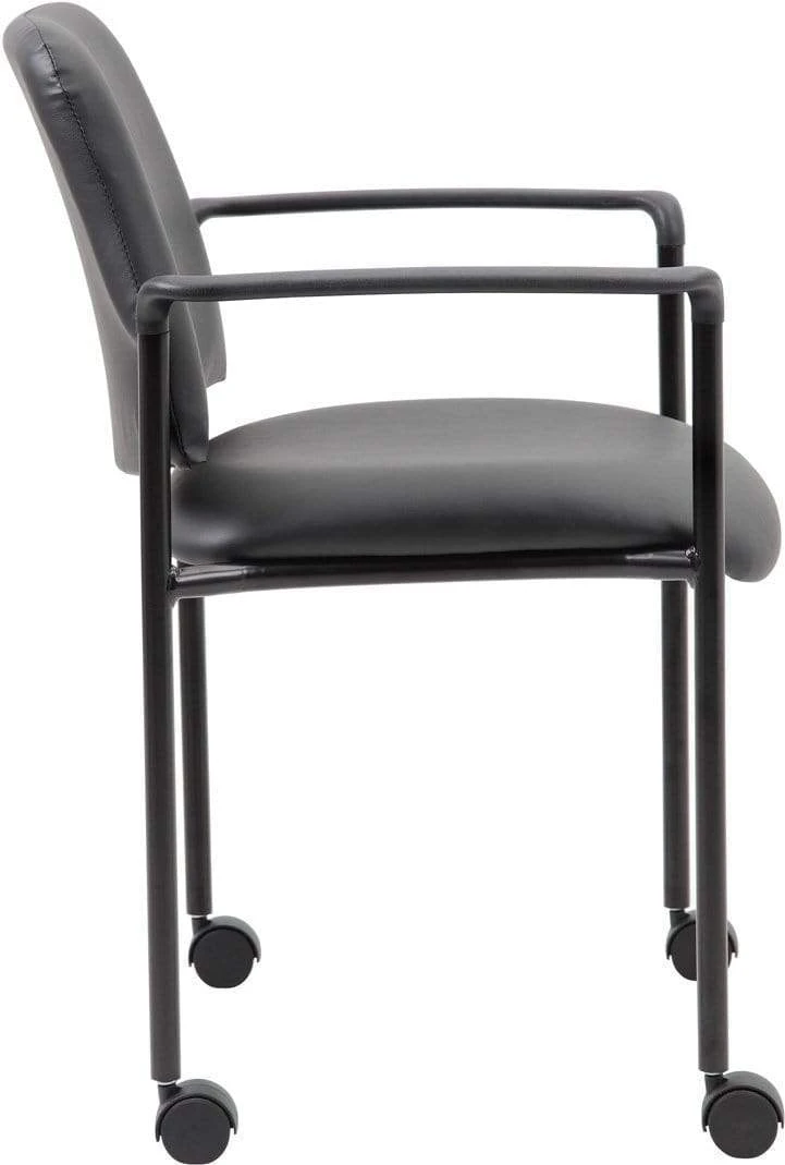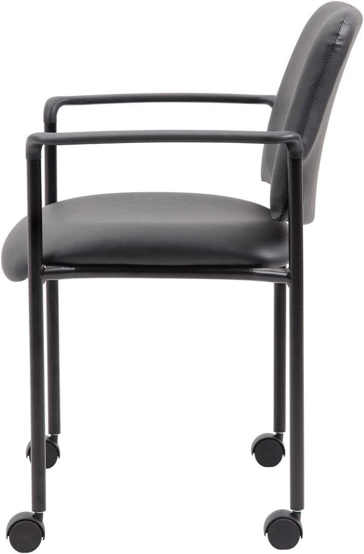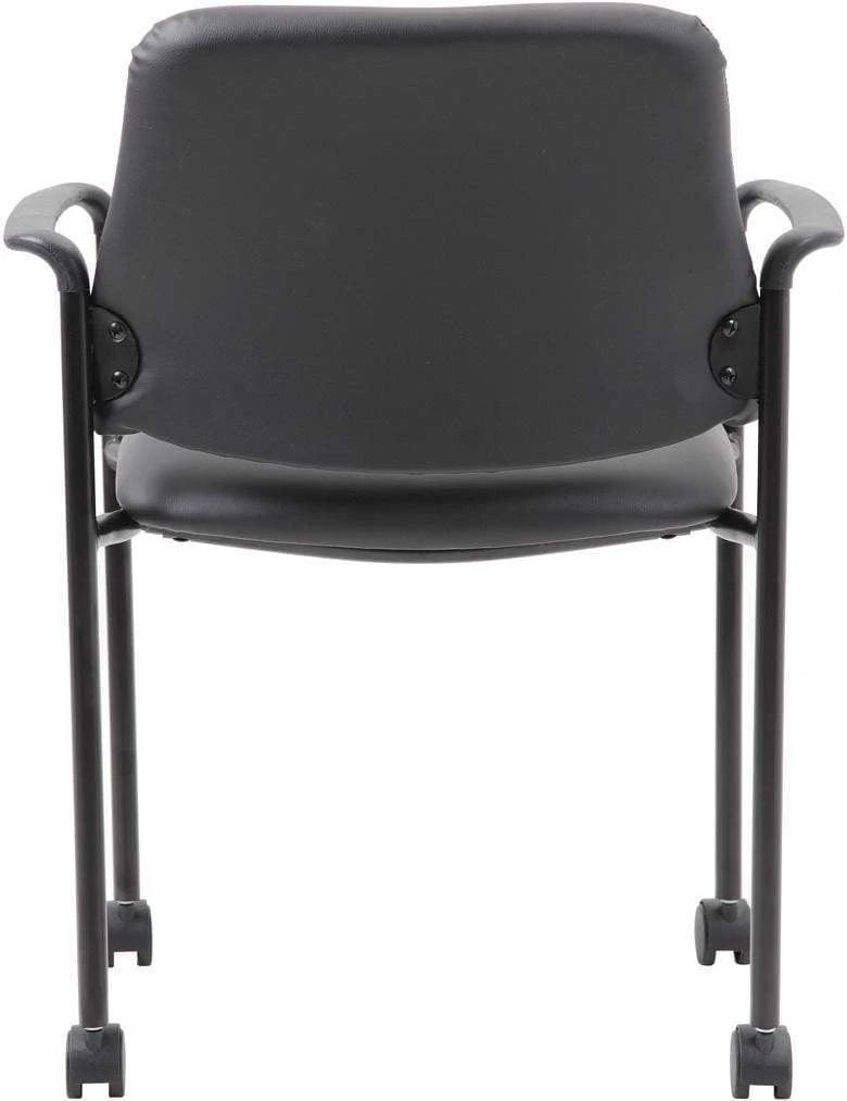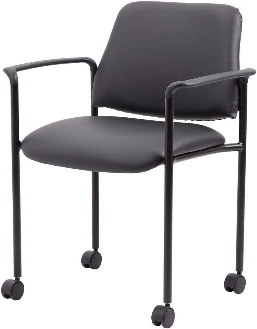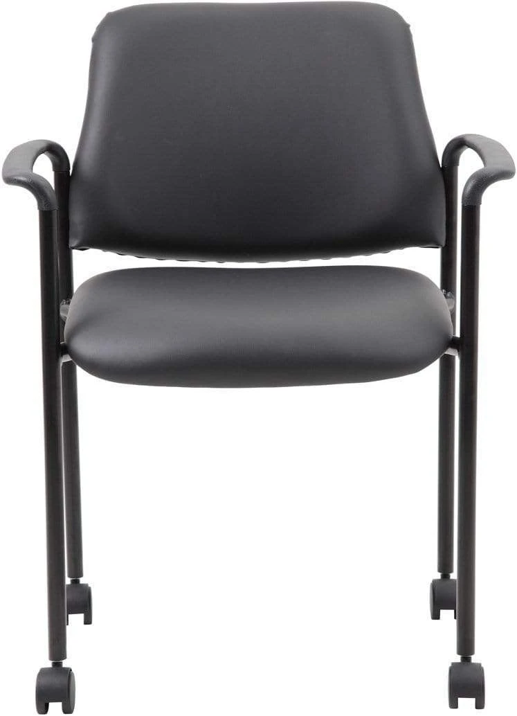 The square back Diamond stacking chair in black vinyl offers the perfect seating solution for any space. The chair is made with a gorgeous Caressoft material that is a vinyl upholstery that looks & feels like leather, but is more durable and can be cleaned with a damp cloth. The chairs can be stacked 4 high for ultimate storage capacity. It is designed with black fixed arms for extra comfort and adds a pop of class to any room or office. The chair has a sturdy four leg tubular base in black steel with 4 hooded dual wheel casters and offers a weight capacity of 275 lbs.
