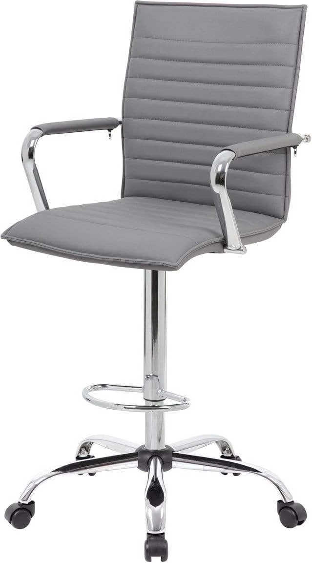 The ribbed design drafting stool comes in a lavish black vinyl material and is a comfortable seating option for most any office or studio. The drafting stool provides a pneumatic gas lift mechanism for adjustable height options, making this great for most any desk or drafting table. The stool also features a sturdy and fancy 27 inch chrome base with 2 inch nylon dual wheel casters for a smooth roll and has a weight limit of 275 lbs.