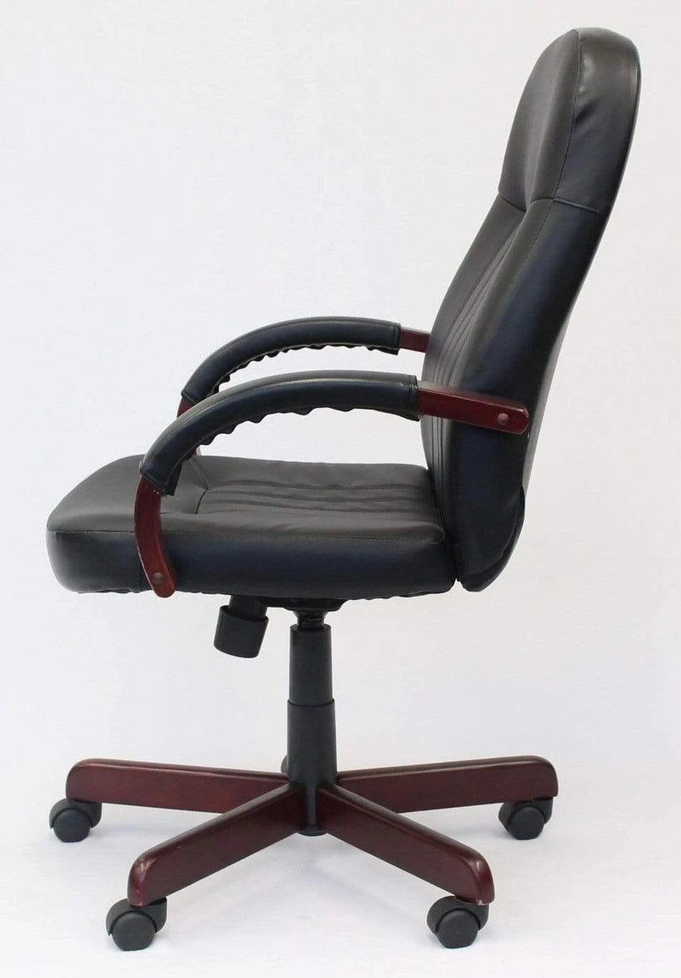 This beautifully upholstered, LeatherPlus office chair from Boss Office Products features an executive high back design with the elegant mahogany wood finish on the hardwood arms and leg caps. This executive series LeatherPlus office chair also features padded, leatherPlus upholstered arms, passive ergonomic seating with built in lumbar support, pneumatic gas lift seat height adjustment, adjustable tilt tension control, upright locking position and a large 27″ base with dual wheel hooded casters. Dimensions: Seat size: 20″W x 19″D. Back size: 20″W x 24″H. Seat height adjustment: 16.5-20″H. Fully warranted by Boss Office Products. These mahogany finish office chairs normally ship within 2 business days from our GA or CA warehouse.
