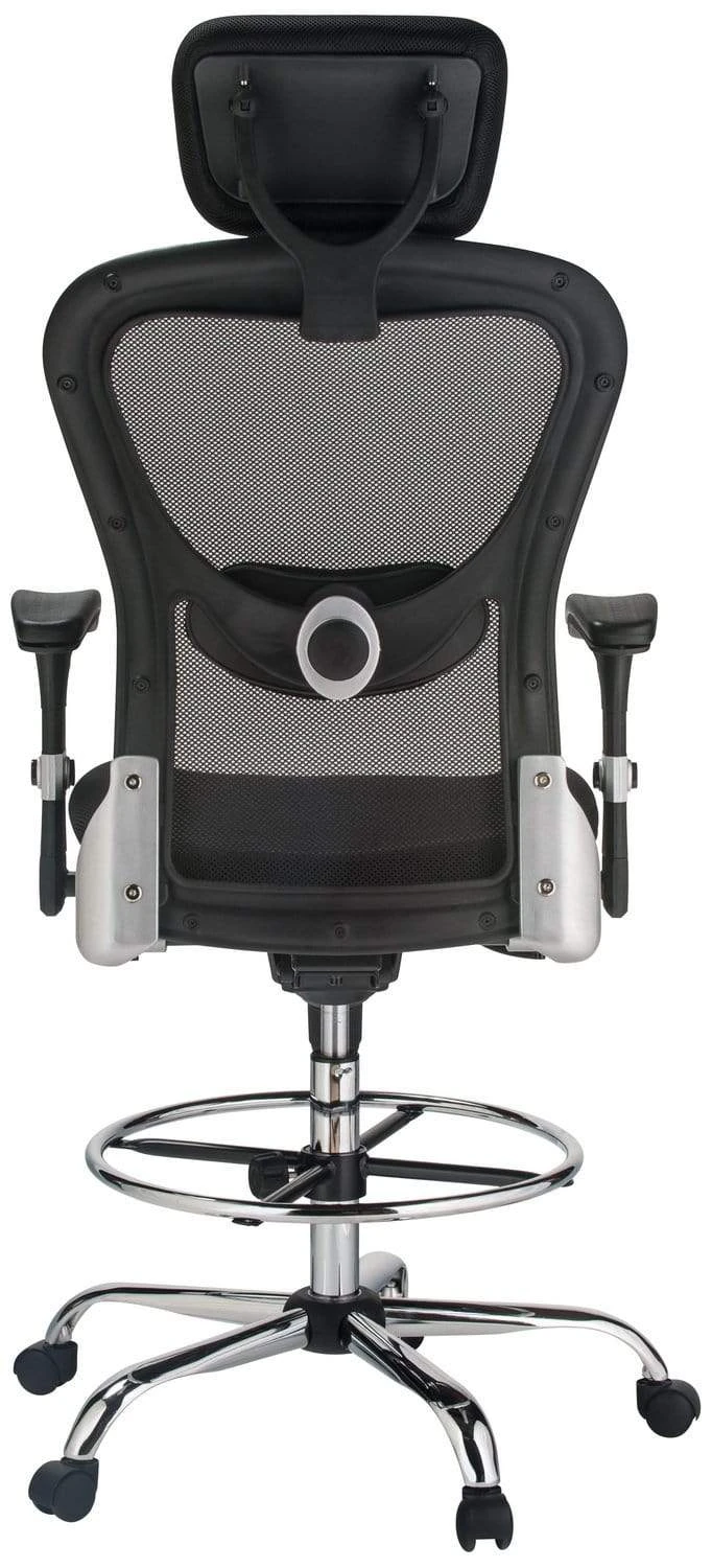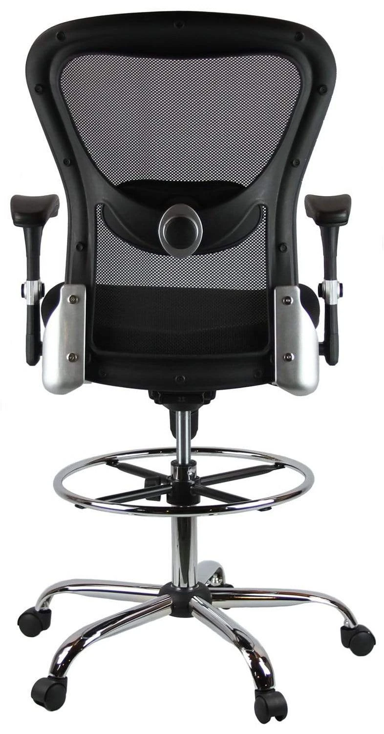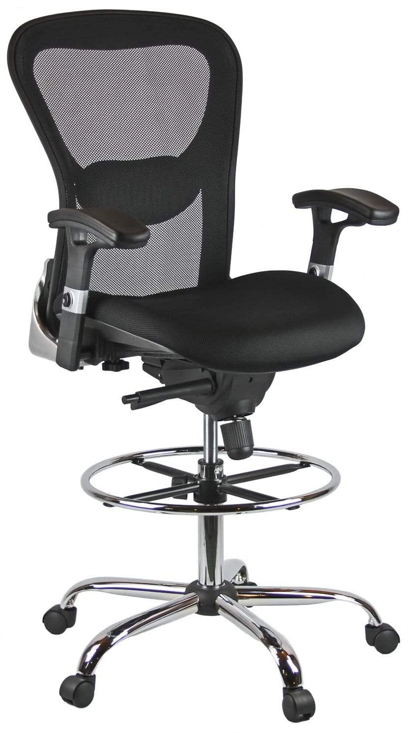 Hot Item!This contemporary mesh drafting stool from Harwick features a breathable mesh back with built-in lumbar for maximum support and ventilation. Adjustments include pneumatic seat height adjustment, 2 to 1 synchro-tilt (the back reclines at a faster pace than the seat to keep your feet flat on the floor), height and width adjustable armrests, lumbar tension adjustment (adjusts up/down and in/out) and a waterfall seat to relieve pressure on your legs so you can sit comfortably for longer periods of time. The large 20″ chrome foot ring adds an attractive contemporary style. It also includes a heavy-duty, chrome-plated steel base with dual-wheel casters.