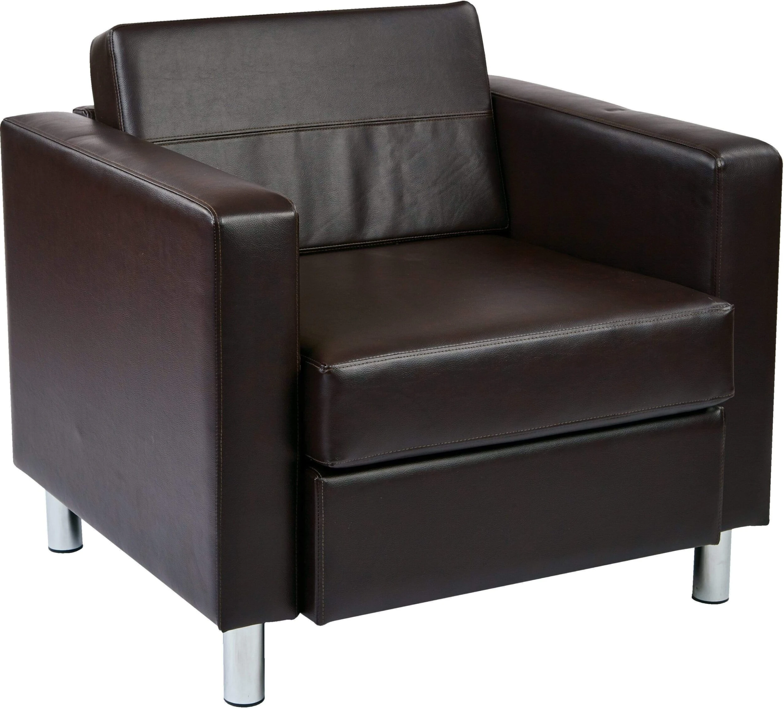 Vinyl is hot with the Avenue Six Pacific Arm Chair in Espresso. Outfitted with vinyl that is sturdy and easy to clean, this chair is bound to last and look great for many years to come. Chrome metal legs are the perfect accent to a contemporary chair yet simple enough to match the decor at home or the office.