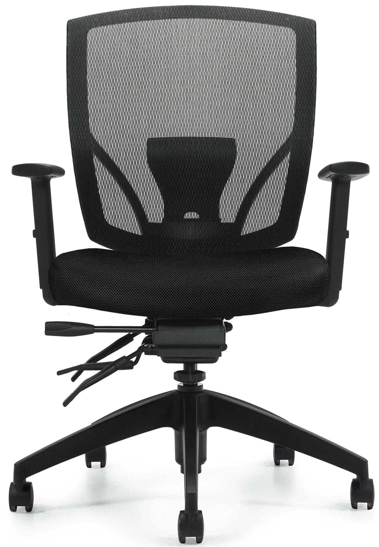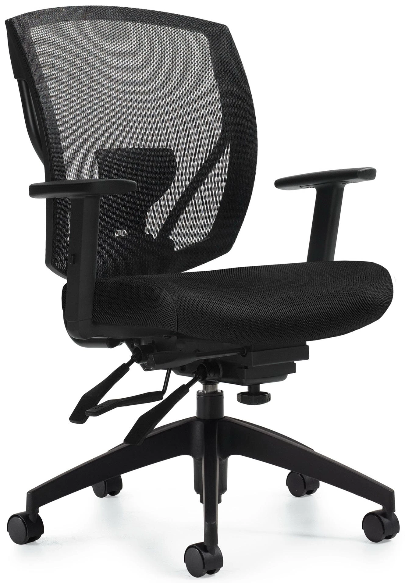 This ergonomic mesh office chair from Offices To Go™ features a black screen mesh backrest for maximum support and ventilation. Other features include resilient high-density foam seat padding, seat upholstered in black mesh fabric, adjustable lumbar support, one-touch pneumatic seat height adjustment, 360-degree swivel, height adjustable T-shape armrests, tilt with infinite position tilt lock, tilt tension adjustment, adjustable forward tilt, back angle adjustment and a scuff resistant high rise molded base with twin wheel carpet casters. This chair meets or exceeds ANSI/BIFMA standards.