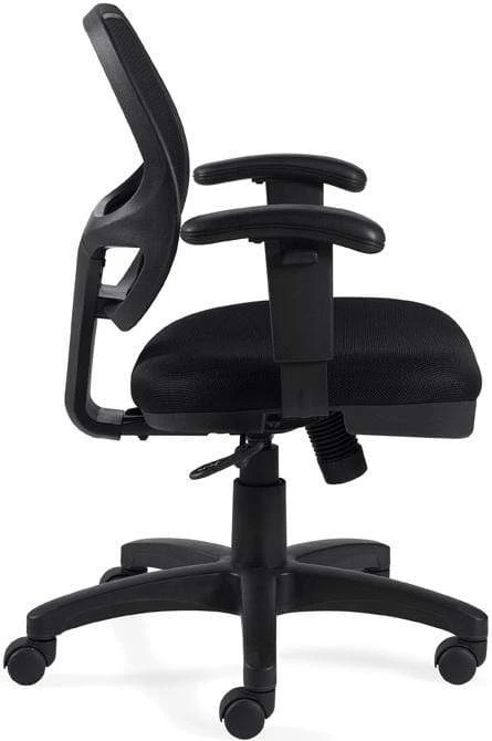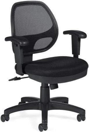 This mesh office chair from Offices To Go™ features an attractive and supportive screen mesh backrest for maximum airflow and a thickly padded seat cushion upholstered in black mesh fabric. Other features include height adjustable arms, one touch pneumatic seat height adjustment, synchro tilt control with tilt tension adjustment, tilt lock, fixed back angle, 360-degree swivel and a scuff-resistant arched molded base with twin wheel carpet casters. This mesh office chair meets or exceeds ANSI/BIFMA standards.