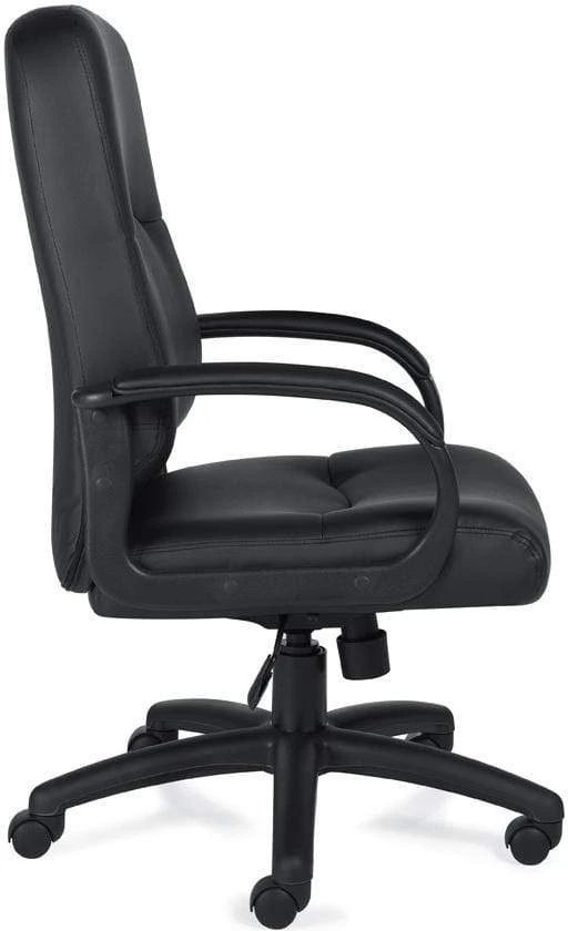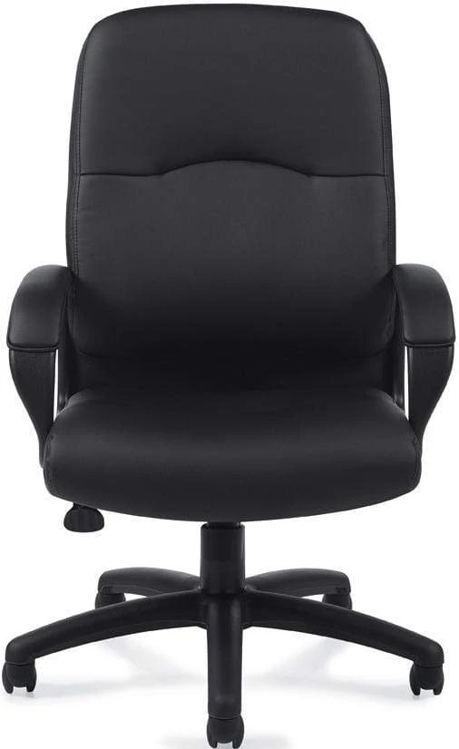 This executive office chair from Offices To Go™ features attractive black Luxhide leather upholstery over thickly padded seat and backrest cushions with matching mock leather trim. Luxhide leather is a bonded reconstituted leather consisting of genuine leather fibers combined with other materials for long-lasting durability.