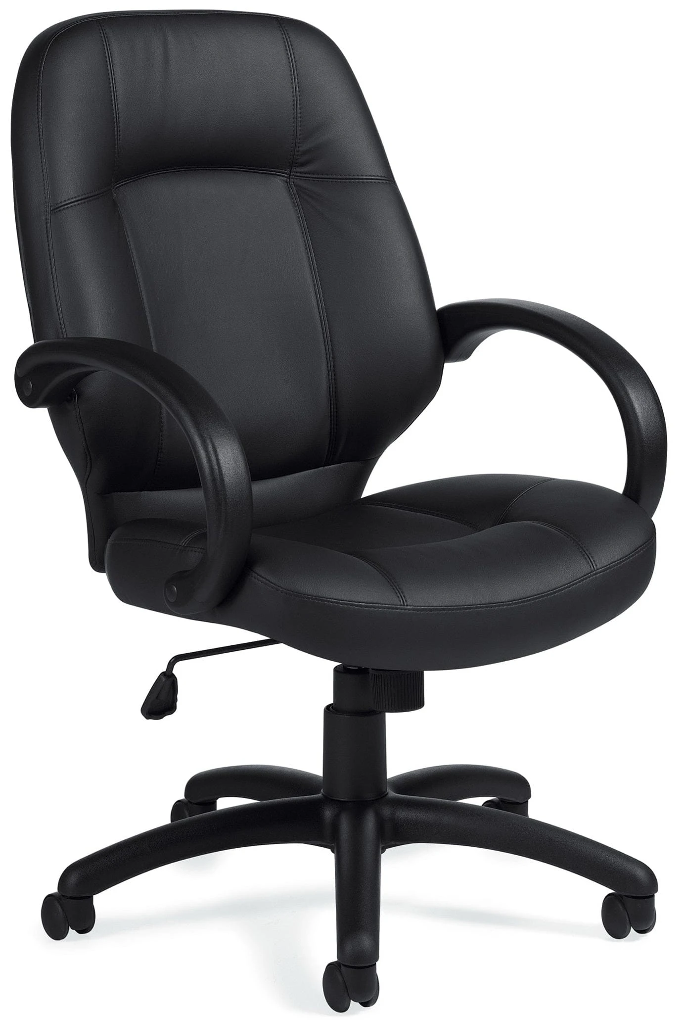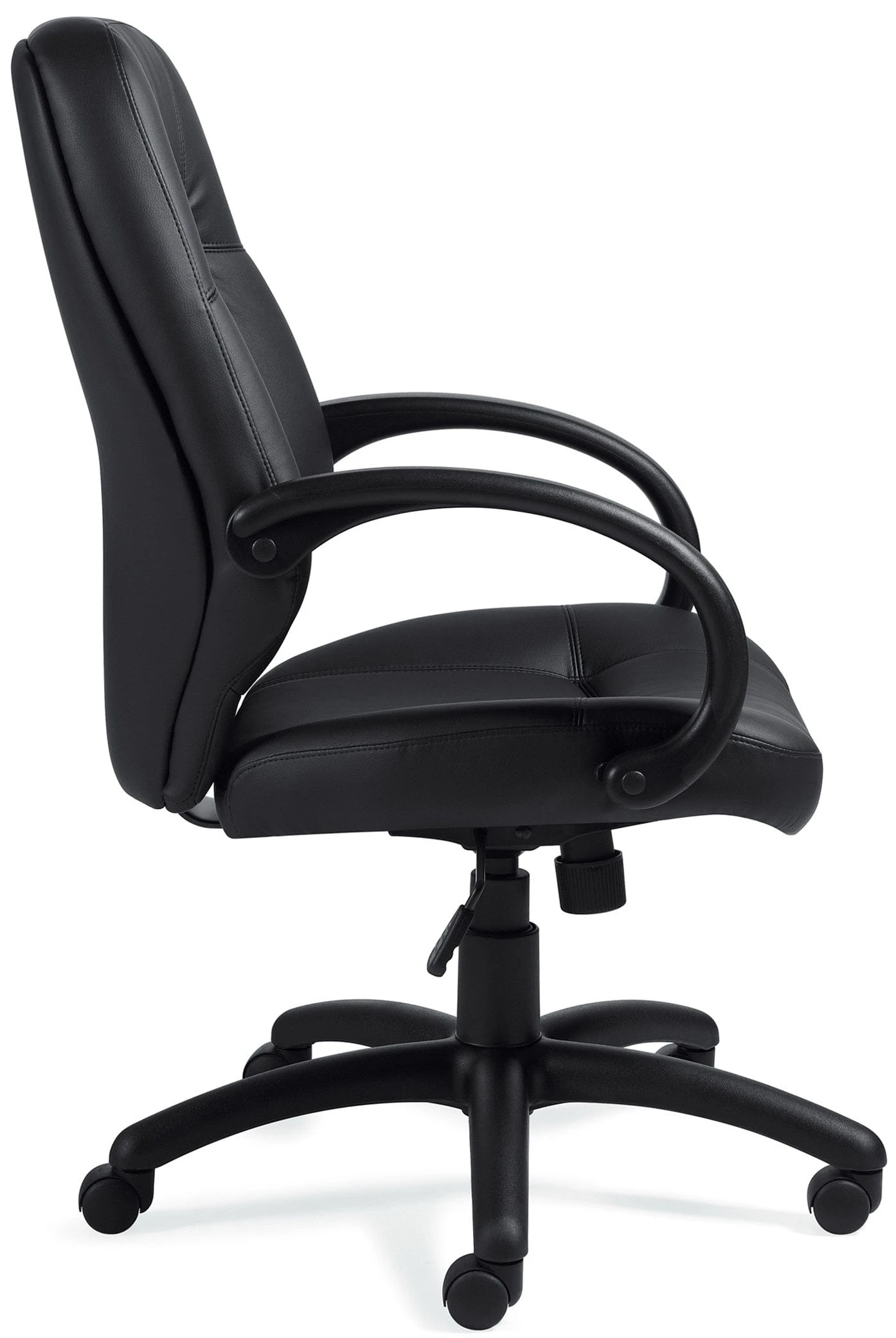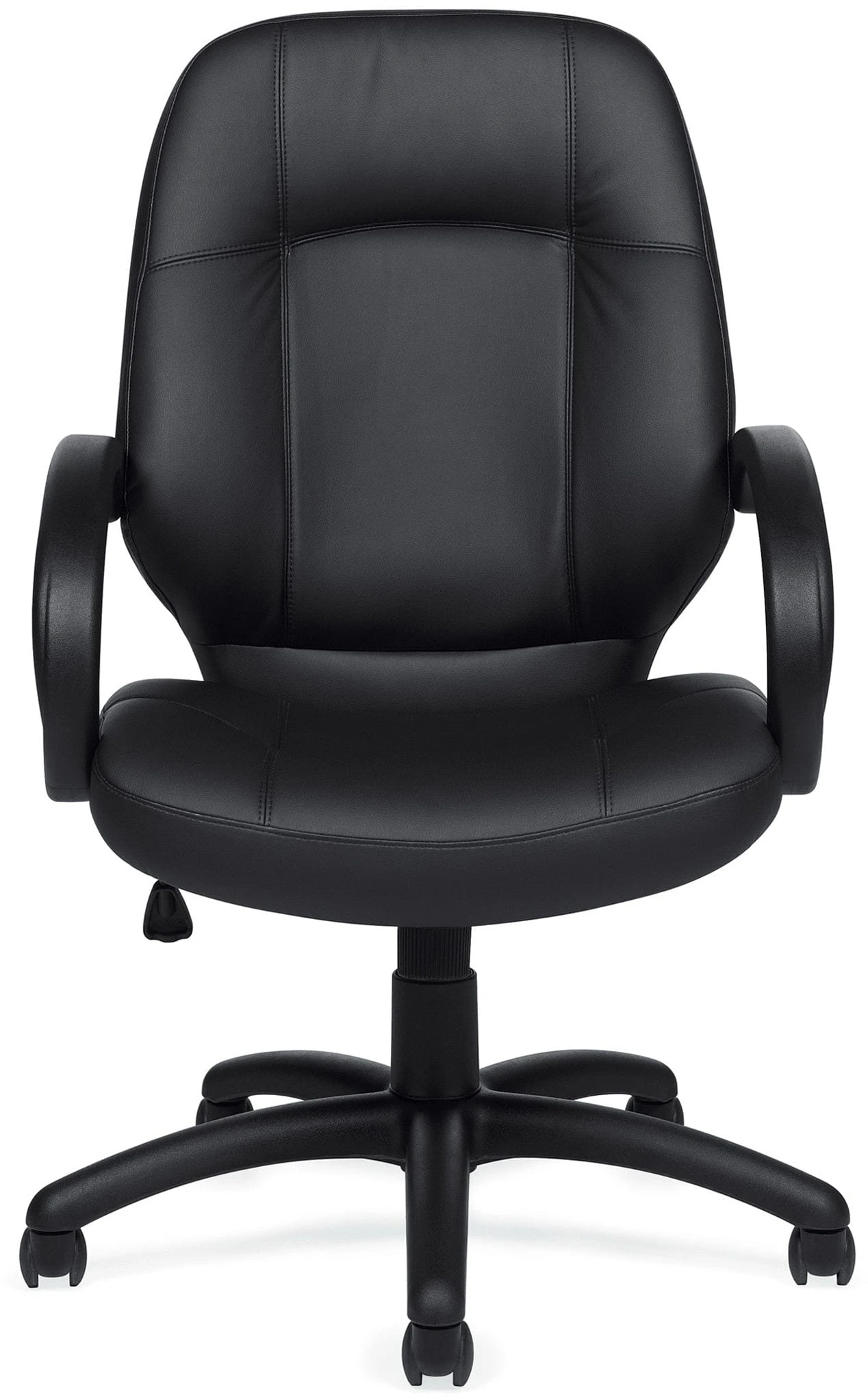 This high back executive office chair from Offices To Go features eco-friendly Luxhide leather upholstery. Luxhide consists of bonded leather fibers for strength and durability with a soft faux leather finish. Other features of this chair include thick foam filled contoured cushions, pneumatic seat height adjustment, 360 degree swivel, black molded arms with upholstered arm caps, tilt with tilt lock, tilt tension adjustment, waterfall seat edge, and a scuff resistant arched molded base with twin wheel carpet casters. This chair meets or exceeds ANSI/BIFMA standards.