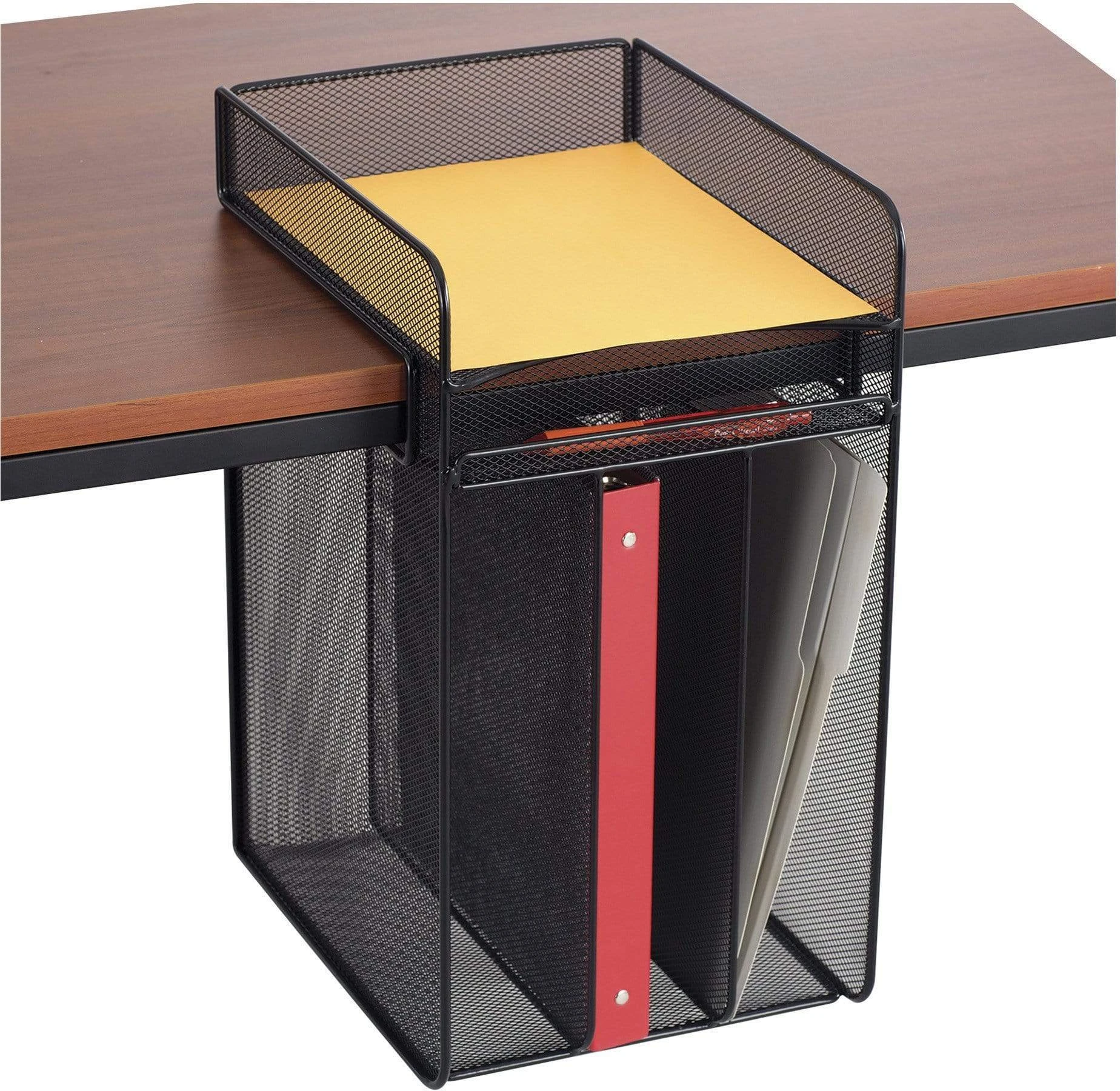 The Onyx⢠horizontal hanging storage unit is a wire mesh organizer that easily attaches to a desktop and hangs below it, providing underdesk storage that saves space and time. Features one desktop tray and four underdesk trays for sorting letter-size documents, folders and files. It also has an underdesk pencil tray for storing pens, pencils and other supplies. The hanging storage design keeps your desktop clutter free and pairs well with standing-height or adjustable-height desks or tables. This sleek mesh organizer attaches to surfaces up to 1 ¾” thick and includes a rubber-headed tightening screw so that it can be securely mounted without damaging the surface. Created with a steel base and powder coat finish for added durability.