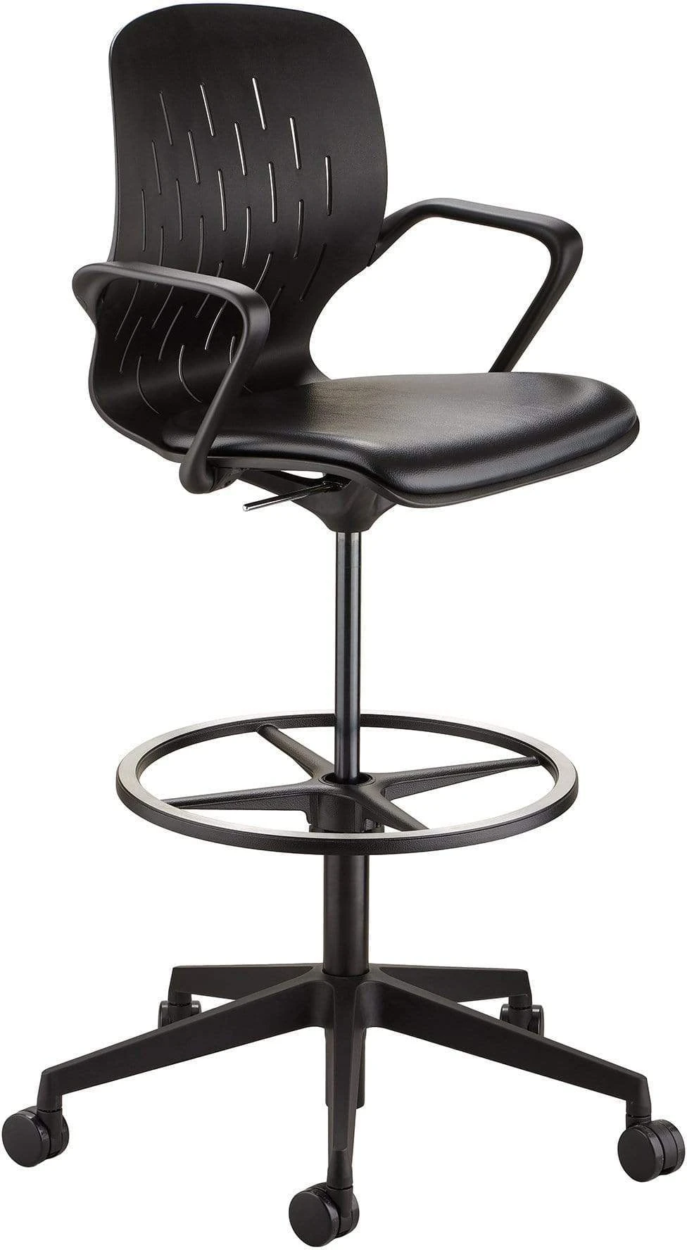 The easy-to-use Shell™ Extended-Height Chair provides intuitive adjustments and a sleek design that suits any workspace. Featuring a contoured back for lumbar support and a frame that naturally flexes to fit the individual user, this drafting chair is great for long work days. For additional comfort, the seat and arms are available with Black upholstered padding. The seat’s back includes stylish holes that provide comfortable breathability during use. Upholstery is vinyl, making it easy-to-clean. The seat height of this chair is easily adjustable from 22-32” to suit a wide range of user heights. This height pairs perfectly with standing or adjustable-height desks to help encourage a more active, yet comfortable, workday. The flat footring around the base provides an ergonomic support while sitting, and is adjustable to suit the needs of the user. A sturdy, 5-star base with casters and 360-degree swivel capabilities ensures the user can move and reach anything they need throughout the day. Also available in White and standard-desk height task chair to suit a variety of personal preference or décor. Great for use in personal workspaces, computer labs, home offices, design studios, architecture firms, warehouses, conference rooms or anywhere else an extended-height char is needed.